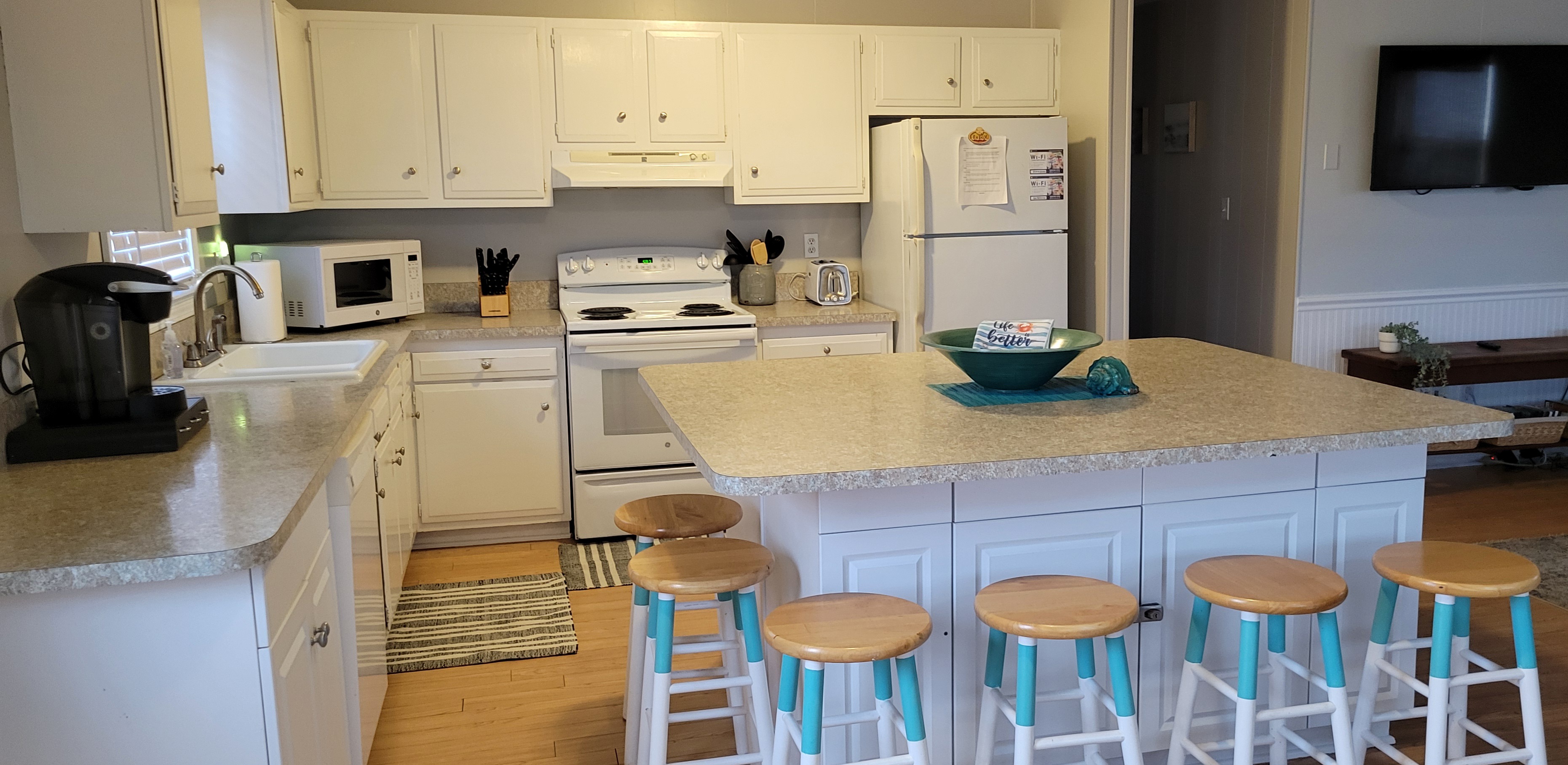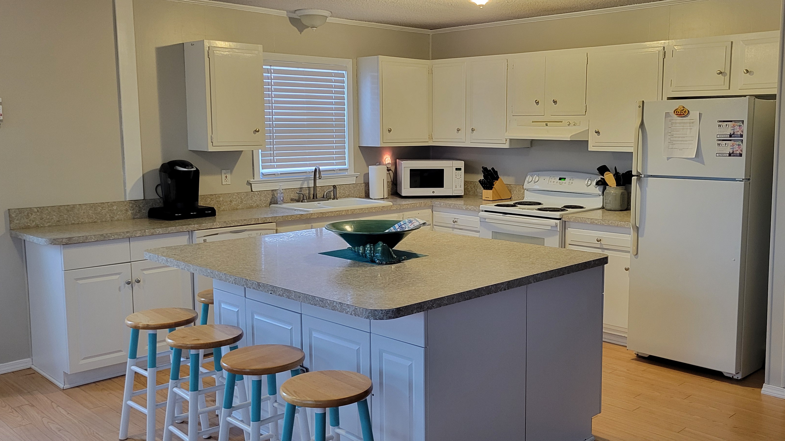 Gather around the large kitchen island — the perfect spot for cooking together or simply sharing conversation. Our fully equipped kitchen has everything you need to prepare meals for your family or group, with modern appliances, plenty of cookware, and all the essentials to make dining in easy and enjoyable.
